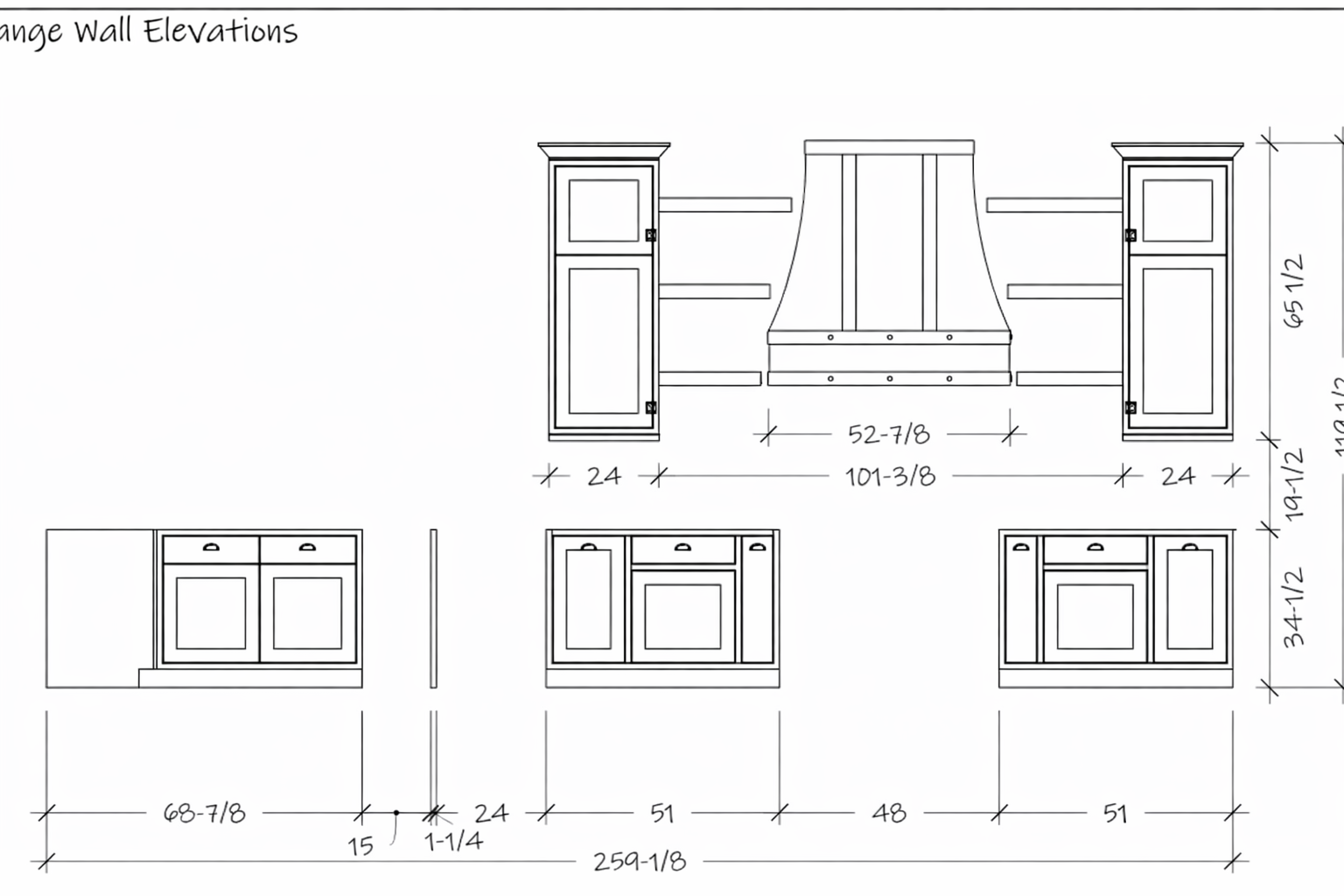 We produce the full cabinet package: dimensioned plan(s) and finalized layout, elevations for each wall/run with key notes and callouts, and critical sections/details for tricky conditions (appliance interfaces, panels, fillers, trim, tall units, islands).